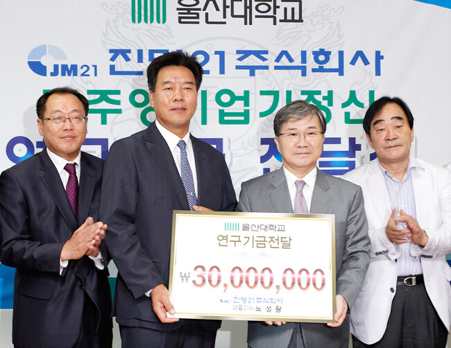 울산의 대표적 향토기업인 진명21㈜의 노성왕 대표이사가 ‘정주영 기업가정신 연구’를 위해 울산대 공공정책연구소(소장 이달희)에 연구기금 3000만 원을 기부했다. 특히 민간에서 울산대에 연구 장려 기금을 전달한 것은 이번이 첫 사례다.