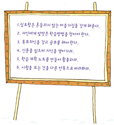 “‘시험이 싫다. 시험이 빨리 끝났으면 좋겠다’라고 생각하는 학생이 대부분이죠. 하지만 시험은 나의 숨겨둔 실력을 발휘할 기회이고 칭찬을 받을 기회입니다. 틀린 문제가 나왔을 때는 오히려 반가워해야 합니다. 이 문제를 극복하면 이와 유사한 문제를 풀어낼 힘이 생기기 때문이에요. 집요하게 그것이 정답인 이유, 혹은 정답이 아닌 이유를 스스로가 진정으로 납득할 때까지 물고 늘어져 해결해야합니다. 그러면 틀린문제는 자신을 좌절시키는 짜증덩어리가 아니라 자신의 부족한 점을 보완해 주는 절호의 기회가 되고, 100점으로 갈 수 있는 지름길이 됩니다.”