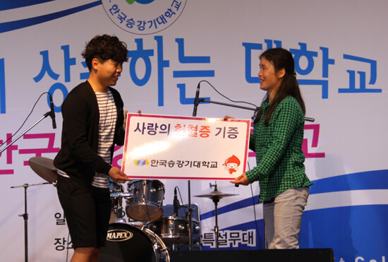 한국승강기대(총장 박영규) 총학생회(회장 이한별)는 9일 총학생회 축제 전야제 행사에서 학생들이 자발적으로 기부한 헌혈 증서를 무혈성빈혈 환자인 김 할머니에게 전달했다.