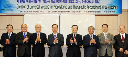 건국대는 이날 강연을 위해 세계 최초로 AIDS 예방백신을 개발한 캐나다 웨스턴온타리오대(The University of Western Ontario) 강칠용 교수를 초청했다. 이 자리에서 강 교수는 ‘Creation of Universal Vectors for Prophylactic and Therapeutic Recombinant Virus Vaccines’(재조합 벡시니아 바이러스 벡터를 이용한 범용 예방 및 치료 백신 개발)이라는 주제로 강연을 맡았다.