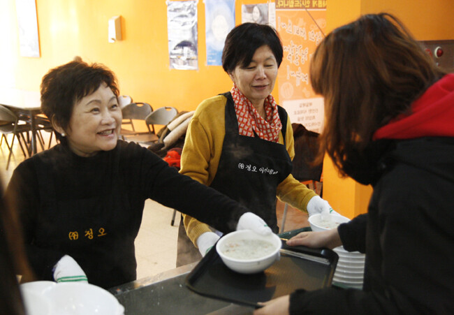 덕성여대(총장 지은희)는 기말고사 기간인 10일부터 14일까지 학생들에게 총장과 본부 보직자들이 직접 영양죽을 제공한다. 해당 기간 중 매일 오전 8시 30분에서 9시 30분까지 학생회관 식당에서 아침식사로 영양죽이 제공된다. 시험공부를 위해 아침을 거르고 등교하는 학생들을 위해 마련된 영양죽 이벤트는 든든한 아침식사로 학습능률을 올려 좋은 성적을 거두기를 바란다는 응원의 의미로 기획됐다. 덕성여대의 영양죽 제공은 6년째 계속되고 있는 전통 행사로 학생들의 만족도가 크다. 소고기브로컬리죽, 단호박죽, 전복죽, 닭채소죽, 단팥죽 등 요일마다 특색있는 메뉴로 충분한 양을 배식할 예정이다. 사진은 영양죽을 배식 중인 지은희 총장(좌측)과 이옥 기획처장(우측)의 모습.