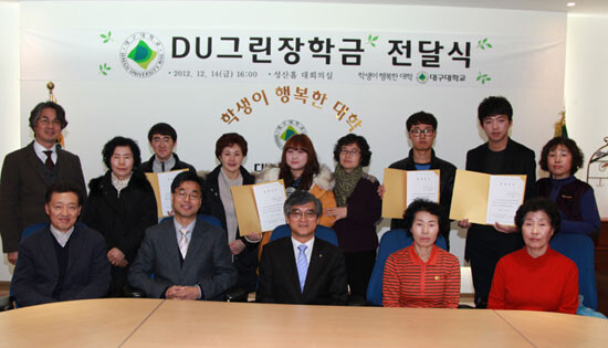 대구대(총장 홍덕률)는 14일 경산캠퍼스 대회의실에서 홍덕률 총장, 김경순 대구대 시설관리지회장, 장학생, 대학 관계자, 시설관리지회 집행부 등 20여 명이 참석한 가운데 장학금(DU그린장학금) 전달식을 가졌다.
