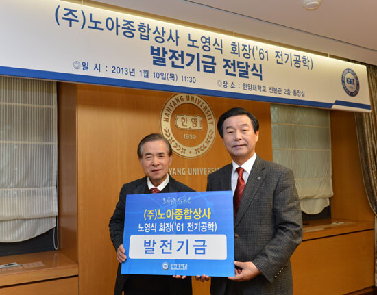 서울ㆍ에리카 캠퍼스에 각각 1억 원을 기탁한 노 회장은 “학교발전에 밀알이 됐으면 좋겠다”고 말했다. 노 회장은 한양대 공대 전기공학과(61학번) 출신이다.