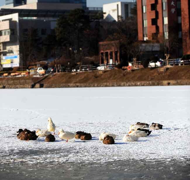한파가 주춤했던 지난 20일 오후 서울 광진구 능동로 건국대 캠퍼스내 일감호에서 눈 덮인 얼음 위로 오리들이 모여 주말 겨울정취를 만끽하고 있다.