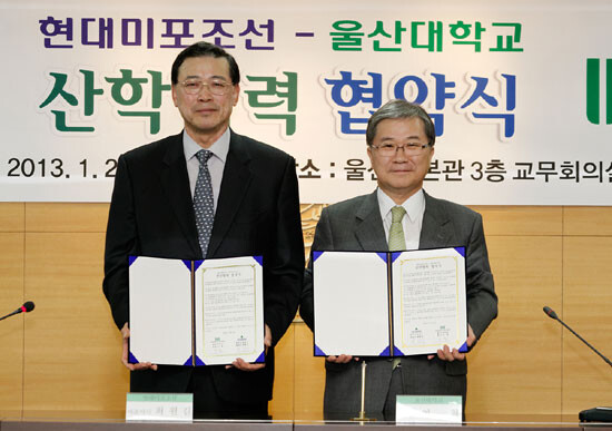 ㈜현대미포조선(대표이사 최원길)과 울산대학교(총장 이철)는 22일 울산대 행정본관 3층 교무회의실에서 조선산업의 당면 위기 돌파를 위한 산학협력협약을 체결하고 조선업무체계 혁신 프로젝트를 수행하기로 했다.