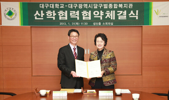 대구대학교(총장 홍덕률)는 31일 경산캠퍼스 성산홀에서 대구시 달구벌종합복지관(관장 김창은)과 사회복지 서비스와 제도 개선을 위한 공동연구, 재학생의 현장실습을 통한 사회복지 전문인력 양성 등을 주요 내용으로 한 상호협력협약을 체결했다.