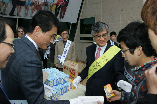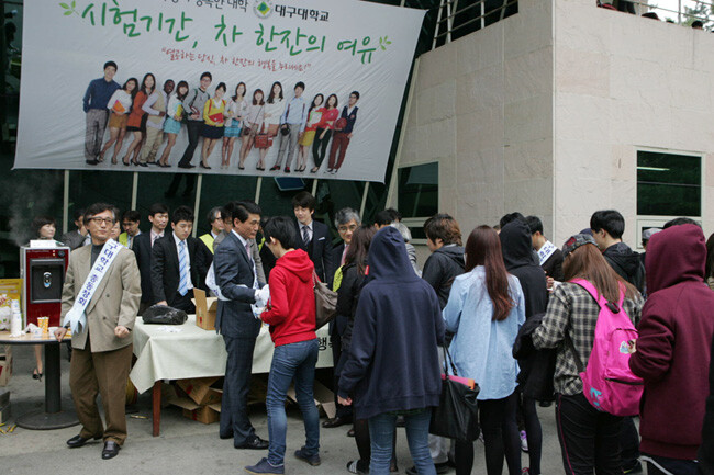 매학기 시험기간이면 어김없이 시험공부에 지친 학생들을 격려하고 소통하기 위해 마련된 ‘차 한잔의 여유’ 행사에는 9명의 총동창회 간부들이 나서 학생들에게 김밥과 주먹밥, 음료 등을 전하며 후배들을 맞았다.