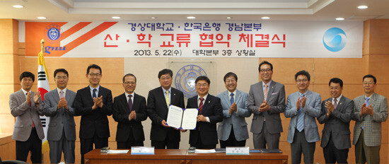 22일 대학본부에서 열린 협정식에는 경상대 권순기 총장, 정병훈 교무처장, 정우건 대외협력본부장, 이성갑 산학협력단장, 김홍범 경제학과 교수와 한국은행 경남본부 김경 본부장, 공철 기획조사팀장, 김영진 기획조사팀과장 등이 참석했다.