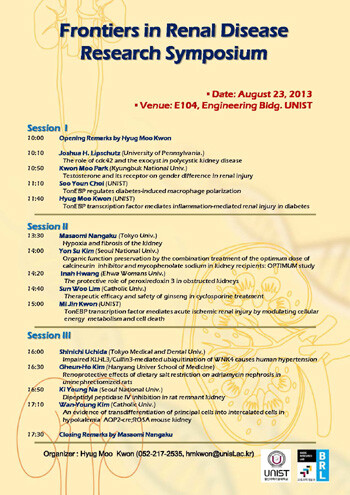 이번 학회는 UNIST 나노생명화학공학부의 ‘염증과 신장병 연구실’(한국연구재단 기초연구실)이 주관하며 ‘신장병 연구의 새로운 경향’ 이라는 주제로 진행된다. 국내외 신장병 분야의 전문가와 연구원, 학생 등 100여 명이 참석할 예정이다.