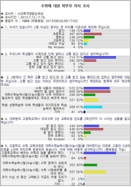사교육걱정없는세상은 지난 7월 12일부터 19일까지 '수학 교과에 대한 학부모 의식조사'를 실시했다. 이번 설문에는 학부모 1009명이 응답했으며 먼저 '우리나라 학생들이 수학으로 인해 얼마나 고통받고 있다고 생각하십니까?' 라는 질문에 응답자의 71%는 '매우 고통받고 있다' 그리고 28%는 '고통받고 있는 편이다' 라고 각각 답했다. 99%의 학부모들이 수학으로 인해 자녀들이 고통받고 있다고 응답한 것.