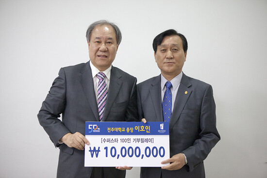 100인 기부릴레이는 전주대 개교 50주년을 기념하기 위해 마련된 특별 발전기금 모금 캠페인으로 1호 기부자가 다음 순위 기부자를 추천하는 릴레이 형태의 모금 운동이다.