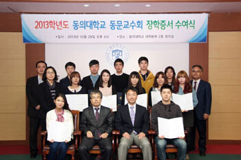 동의대 동문교수회는 2004년 결성돼 현재 34명의 교수들이 후배들의 장학기금 모금에 참여하고 있다. 2010년부터 매년 적립금을 장학금으로 지급하고 있으며 올해 15명을 포함, 지금까지 40여 명의 후배들에게 장학금을 지원했다.