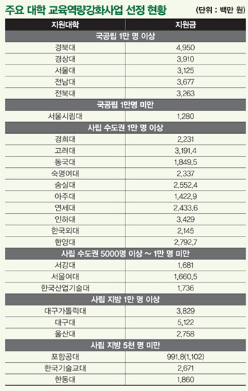 교육부는 대학 교육분야에 대한 재정지원을 확대하고자 2008년 교육역량강화사업을 도입한 뒤 매년 지원대학을 선정하고 있다. 2013년에는 총 150개 대학(분교 3개교 포함)이 사업에 신청한 가운데 평가를 통해 82개 대학이 최종 선정됐다. 지원대학은 재학생을 기준으로 △국공립 1만 명 이상 △국공립 1만 명 미만 △국공립 교원양성대학 △사립 수도권 1만 명 이상 △사립 수도권 5000명 이상~1만 명 미만 △사립 수도권 5000명 미만 △사립 지방 1만 명 이상 △사립 지방 5000명 이상~1만 명 미만 △사립 지방 5000명 미만으로 구분, 선정됐다.