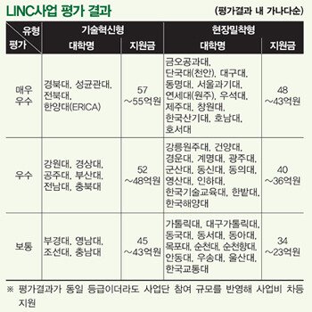 교육부는 지난 6월 산학협력선도대학(Leaders in INdustryuniversity Cooperation, 이하 LINC) 육성사업에 대한 연차평가를 발표했다. 교육부는 이번 평가를 통해 기술혁신형사업의 경우 ‘매우우수’ (55억~57억 원), ‘우수’ (48억~52억 원), ‘보통’ (43억~45억 원) 등 3등급을 매겨 평가결과와 사업단 규모에 따라 지원금을 차등 지급한다. 현장밀착형 사업도 ‘매우 우수’ (43억~48억 원), ‘우수’ (36억~40억 원), ‘보통’ (23억~34억 원) 등 3단계 평가를 통해 사업비가 차등 지원된다.