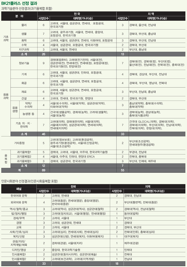 현 정부의 키워드는 ‘창조경제’다. 이를 위해 교육부와 한국연구재단은 2013년부터 ‘BK21플러스(Brain Korea 21 Program for Leading Universities&Students)’ 사업을 통해 창조경제를 선도할 석박사급 인력을 양성한다. 이에 앞서 교육부는 세계 수준의 대학원과 지역 우수 대학 육성을 위해 BK21플러스의 전신 사업인 BK21를 1단계(1999년~2005년)와 2단계(2006년~2012년)에 결쳐 추진해왔다. 교육부는 BK21플러스 사업 지원 대상 대학을 지난 8월과 9월 각각 선정, 발표했다. 먼저 8월에는 사업단 기준으로 과학기술분야에서 총 144개 사업단(기초과학 39개/응용 및 기타 중점 86개/융복합 19개)이 선정됐다.