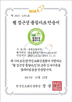 이번 웹 접근성 품질마크는 지난 4일부터 21일까지 사전심사, 전문가심사, 장애인 사용자심사 등의 검증과정을 거쳐 인증됐다.