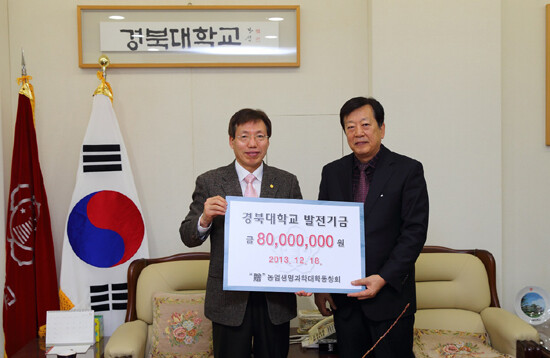 서정렬 농업생명과학대학 동창회장은 18일 김규원 경북대 부총장과의 만남을 갖고 농업생명과학대학 재학생들을 위해 십시일반 모은 발전기금을 전달했다.