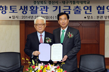 이번 협약에 따라 경산시는 대가대에 향토생활관 건립비 3억 원을 발전기금으로 출연하고, 대가대는 교내에 신축 중인 기숙사에 경산시 향토생활관을 건립해 경산 출신 학생 30명이 입주하도록 할 계획이다.
