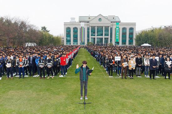 인문대학을 비롯해 11개 단과대학 18개 학부, 9개 학과 3087명의 신입생들은 이날 학사보고를 시작으로 총장 환영사, 총동문회장 축사 등 순으로 진행된 입학식에서 지성인으로서 새 출발을 다짐하는 입학선서를 했다.