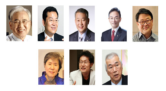 ※사진설명: 윗줄-좌측부터 문용린 교육감, 고승덕 전 국회의원, 안양옥 교총 회장, 이상면 전 서울대 교수, 조전혁 명지대 교수 / 아랫줄-좌측부터 장혜옥 ㈔학벌없는세상 대표, 조희연 성공회대 교수, 최홍이 서울시의회 교육위원장(출처: 공식사이트 또는 공식 SNS)