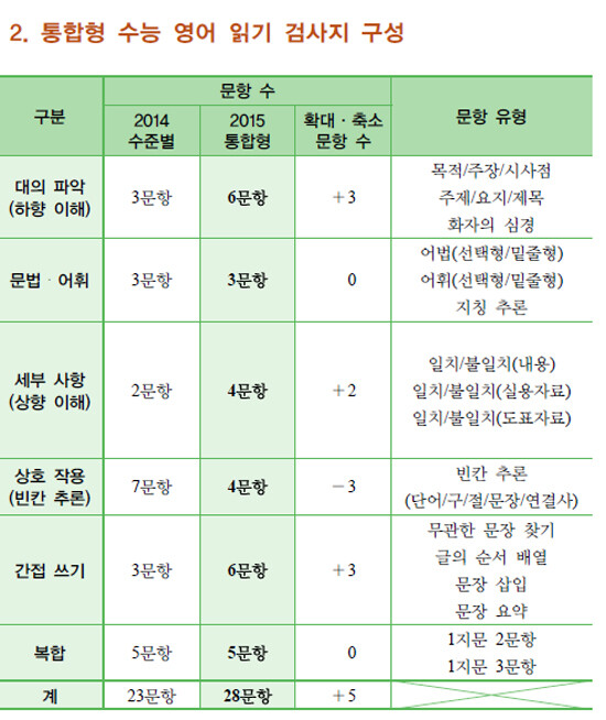 이어 평가원은 "2015학년도 통합형 수능 영어 영역 읽기 평가는 총 23문항으로 구성된 2014학년도 수준별 수능 영어 영역 읽기 평가와 비교하면 모두 5문항이 확대된다"며 "시사점·주제·요지·제목 등의 대의파악 문항 유형에서 3문항, 내용 일치·불일치 등의 세부 사항 문항 유형에서 2문항 그리고 무관한 문장 찾기·글의 순서배열·문장 삽입·문장 요약 등의 간접 쓰기 문항 유형에서 3문항이 각각 확대되는 반면 단어·구·절·문장·연결사 등의 빈칸 추론은 3문항 축소된다"고 밝혔다.