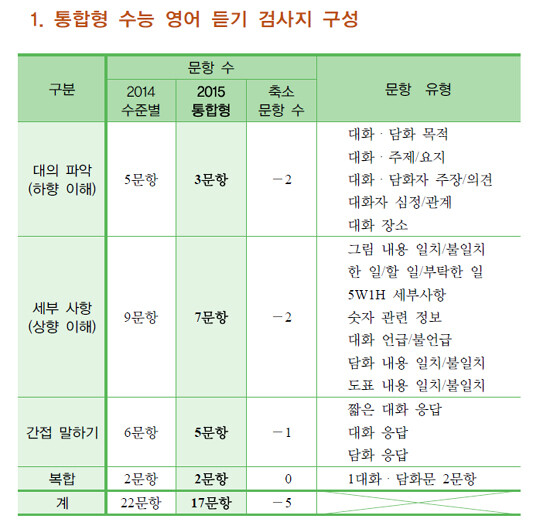 평가원은 "2015학년도 통합형 수능 영어 영역의 듣기 평가는 2014학년도 수준별 수능 영어 영역에 비해 5문항 줄어든 총 17개의 문항으로 구성된다"면서 "2014학년도 수능 영어 A형 시험에서 출제됐던 '지도를 활용한 길 찾기' 문항은 더 이상 출제되지 않는다"고 말했다.