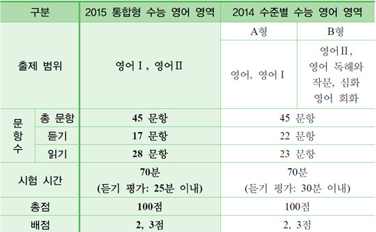 한국교육과정평가원(이하 평가원)이 4일 홈페이지를 통해 공개한 '2015학년도 통합형 수능 영어 영역 학습 안내 및 Q&A 자료집'에 따르면 먼저 출제범위는 2014학년도 A형(영어/영어Ⅰ)과 B형(영어Ⅱ/영어 독해와 작문/심화 영어 회화)에서 2015학년도 영어Ⅰ과 영어Ⅱ로 변경된다.