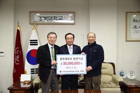 이상흔, 박준식 경북대 명예교수가 12일 함인석 경북대 총장을 방문해 제자들을 위해 써달라며 발전기금 3천만원을 전달했다.
