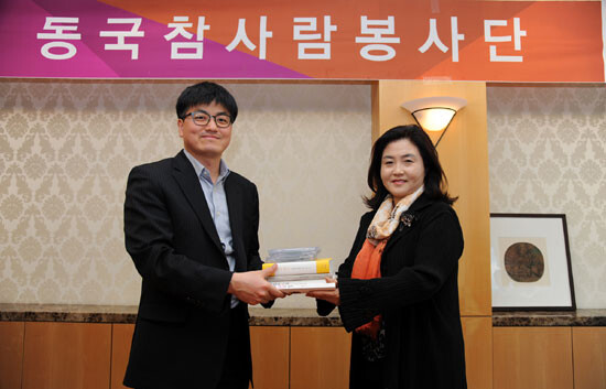 동국대 참사람봉사단(단장 김희옥 총장)은 17일 서울 캠퍼스 본관 5층 소회의실에서 김희옥 총장을 비롯해 교수, 직원, 학생 등 29명이 참여해 녹음한 녹음도서「깨달음(법륜스님 저)」,「인간 붓다 그 위대한 삶과 사상(법륜스님 저)」,「퇴근 후 30분 요리(램블부부 저)」,「사회복지학(장인협, 이혜경, 오정수 저)」등 4권을 서울시립노원시각장애인복지관에 전달했다.