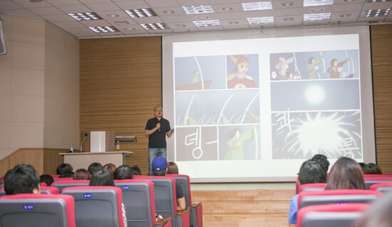 주호민 작가는 이날 250여 명의 재학생을 대상으로 웹툰작가가 되기까지의 과정과 직업인으로서 철학, 스토리텔링 노하우, 진로계획, 향후 목표 등에 대해 밝혔다.