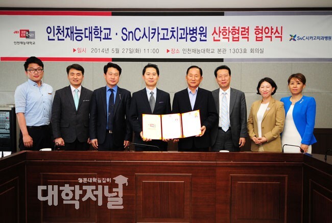 인천재능대학교(총장 이기우)와 SnC시카고치과병원(병원장 송병권)이 지난 27일 본관 13층 회의실에서 이기우 총장과 송병권 원장을 비롯한 관계자 8명이 참석한 가운데 건강증진을 위한 산학협력을 맺었다.
