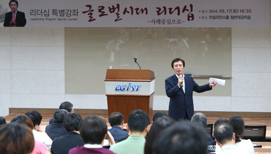 DGIST 학생 및 교직원 200여 명을 대상으로 열린 이날 강좌에서 김 시장은 ‘글로벌 시대 리더십’이라는 주제로 대구광역시 시정을 운영한 경험에서 나온 리더십에 대해 강연했다.