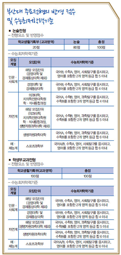 2015학년도 수시모집에서 논술전형을 실시하는데 부산대 논술 고사는 공교육 정상화를 위해 고교 교육과정 범위 내에서 대학수학능력시험을 준비하는 과정에 병행할 수 있도록 출제할 계획이다.