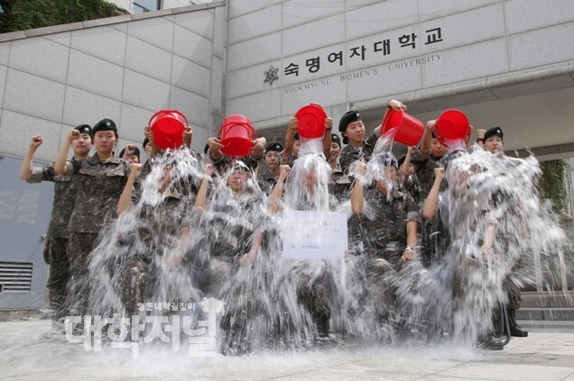 숙명여대 황선혜 총장의 지명을 받은 ROTC 학생들은 30일 교내에서 루게릭병 환자를 돕기 위한 모금 캠페인인 아이스버킷 챌린지에 참여해 단체 얼음물 샤워를 했다.