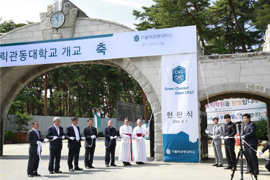 가톨릭관동대는 1일 가톨릭 인천교구 최기산 보니파시오 주교 주례로 열린 개원미사를 시작으로 정문 현판 제막식에 이어 청송관 대강당에서 개교식을 가졌다.