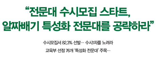 올해 전문대 입시는 특별한 의미를 갖는다. 정부가 전문대학 취업률을 2017년까지 80%로 끌어올리겠다고 밝힌 뒤 시행하는 첫 입시이기 때문이다. 교육과 일자리 연계를 위해 각 대학의 교육과정을 국가직무능력표준(NCS) 연계 과정으로 개편하고 산업체 인사가 참여해 직업적성에 맞는 학생을 선발하는 ‘비교과 입학전형’이 확대 시행된다는 점도 주목하자. 전문대학 졸업 후 곧바로 취업이 가능하도록 한다는 측면에서 이러한 전형을 노려볼 필요가 있다.