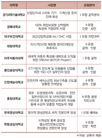 사업별로 구체적인 내용과 선정 대학을 살펴보면 먼저 전문대학 육성사업은 △단일산업 분야 특성화(Ⅰ유형) △복합산업 분야 특성화(Ⅱ유형) △프로그램 특성화(Ⅲ유형) △평생직업교육대학 특성화(Ⅳ유형)로 세분화된다.