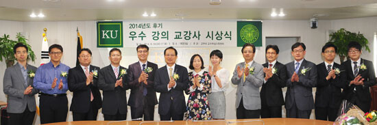 건국대는 지난 27일 ‘2014학년도 1학기 강의평가 우수 교수·강사(베스트티처)를 선정, 시상했다. 이번 베스트티처에는 올해까지 3차례 우수 교강사로 선정되며 3관왕에 오른 공과대학 융합신소재공학과 김화중 교수와 글로벌융합대학 국제학부 손염홍 교수, 2관왕에 오른 문과대학 미디어커뮤니케이션학과 송치만 교수가 포함됐다.