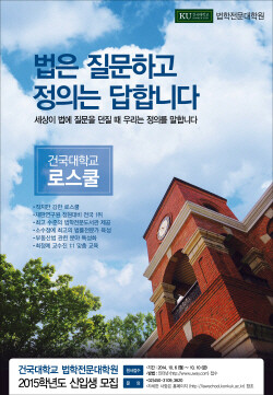 건국대학교(총장 송희영) 법학전문대학원(원장 손동권)은 6일부터 10일까지 2015학년도 로스쿨 법학전문석사과정 신입생 모집을 위한 원서접수를 실시한다. 총 모집인원은 40명으로 ‘가'군으로 모집하며 특별전형 2명과 일반전형 38명이다.