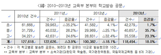 국회 교육문화체육관광위원회 소속 정진후 의원이 교육부로부터 받은 '2010~2013년 기관별 학교발송 공문 현황' 자료에 따르면 소속기관을 포함, 교육부는 2013년에 11만 8494개 초·중·고등학교에 공문을 보냈다. 이는 2012년 10만 382개교보다 18.0% 증가한 수치다. 학교급별로는 초등학교 1.7%, 중학교 35.7%, 고등학교 23.3%로 중학교가 가장 많이 늘었다.