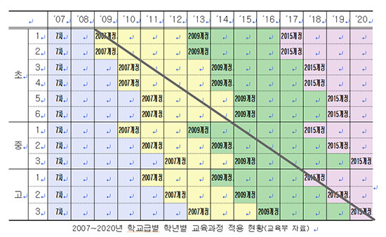즉 최근 교육부는 '2015 개정 교육과정' 도입 계획을 발표했다. 교육부 계획대로 진행된다면 2017년부터 또 다른 교육과정이 단계적으로 적용된다. 결국 올해 초등학교 3학년부터 6학년까지 학생들은 초등학교 입학부터 고교 졸업까지 '2007 개정, 2009 개정, 2015 개정' 등 3개 교육과정으로 공부하게 되는 셈. 또한 올해 중학생과 고등학교 1학년생은 초등학교 입학부터 '7차, 2007 개정, 2009 개정' 등 3개 교육과정을 거쳤거나 거칠 예정이다.