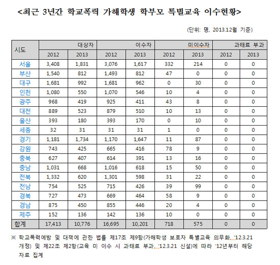 국회 교육문화체육관광위원회 소속 김회선 의원이 교육부로부터 제출받은 '학교폭력 가해학생 학부모 특별교육 이수현황 및 과태료 부과현황'에 따르면 2012년 법 시행 이후부터 2013년 말까지 학교폭력 가해학생 학부모의 특별교육 미이수자는 1만 293명, 과태료 부과는 0원인 것으로 확인됐다.