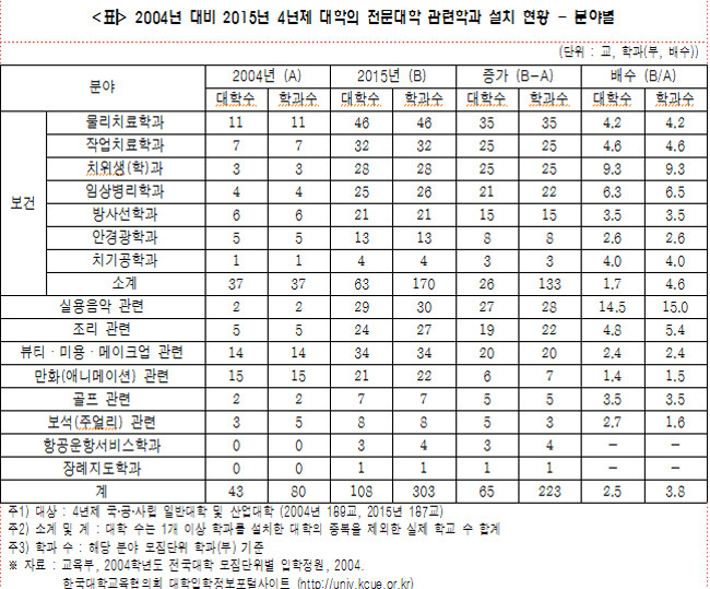 분야별로 보면 전문대학의 대표 학과로 꼽히는 보건계열의 물리치료, 작업치료, 치위생, 임상병리 등의 학과가 급격히 늘어났다. 즉 2004년 물리치료학과를 설치한 4년제 대학은 11개 교였으나 2015년에는 46개 교로 4배 넘게 증가했다. 작업치료학과를 설치한 대학도 2004년 7개 교에 불과했지만 2015년에는 32개 교로 크게 늘었으며 치위생(학)과 설치 대학은 3개 교에서 28개 교로, 임상병리학과 설치 대학은 4개 교에서 25개 교로 증가했다. 또한 보건계열의 방사선학과, 안경광학과, 치기공학과 설치도 모두 증가했으며 이에 따라 4년제 대학에 설치된 전문대학의 보건계열 학과는 2004년 대비 4.6배 늘었다.