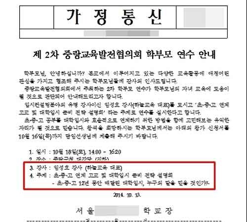 사교육걱정없는세상(이하 '사교육걱정')에 따르면 중랑교육발전협의회(회장 홍순철)가 오는 18일 오후 2시 중랑구청 대강당에서 임성호 하늘교육 대표를 초청, 중랑구 관내 학부모들을 대상으로 입시설명회를 개최한다. 중랑교육발전협의회는 중랑구 관내 전·현직 초중고 학교장과 교감, 학교운영위원 등 공교육 관계자들이 주로 참여하는 협의체다. 이날 입시설명회는 '초중고 12년 동안 매달린 대학입시, 누구의 말을 믿을 것인가?'를 주제로 진행되며 학부모들의 입시설명회 참석 독려를 위해 가정통신문도 배포된 것으로 확인됐다.