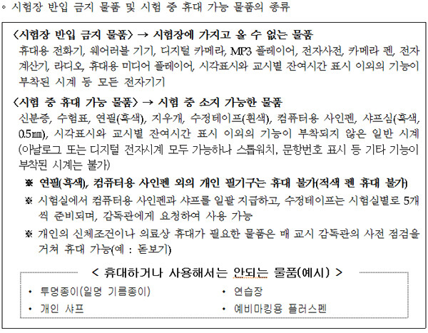 이에 수험생들은 수능 당일 오전 8시 10분까지 지정된 시험실에 입실해야 한다. 특히 1교시가 8시 40분에 시작되지만 1교시를 선택하지 않은 수험생들도 8시 10분까지 입실, 감독관으로부터 컴퓨터용 사인펜과 샤프를 지급받고 수험생 유의사항 안내를 받은 후 감독관 안내에 따라 지정된 대기실로 이동해야 한다.