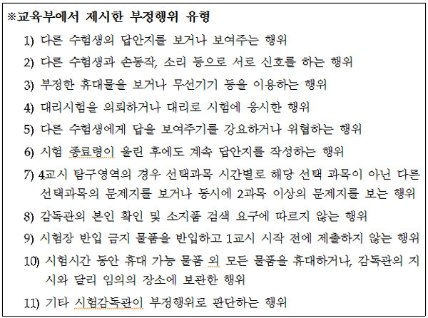 부정행위 유형별로는 휴대폰 소지가 290건으로 가장 많았다. 2개 과목을 선택, 응시하도록 한 4교시 시험에서 각 과목당 배정된 시험시간을 지키지 않고 미리 다음 과목 문제를 풀이하다 적발된 건수도 287건이었다. 이외에도 MP3 소지 43건, 시험시간 종료 후 답안 작성 42건, 전자사전 등 반입금지 기기 소지 27건, 감독관 지시 불이행 16건 등으로 나타났다. 부정행위자 전원은 시험이 무효 처리됐고 다음 연도 시험 응시자격까지 박탈된 학생들도 있었다.