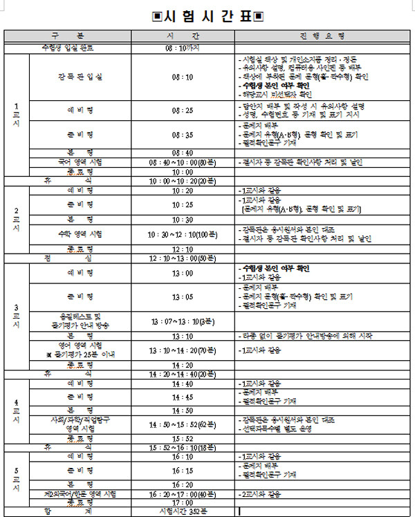 그리고 8시 40분부터 1교시 국어영역이 시작된 가운데 국어영역은 10시 마무리된다. 이어 2교시 수학영역이 10시 30분부터 12시 10분까지, 3교시 영어영역이 13시 10분부터 14시 20분까지, 4교시 사회/과학/직업탐구영역이 14시 50분부터 15시 52분까지, 5교시 제2외국어/한문영역이 16시 20분부터 17시까지 각각 진행된다.