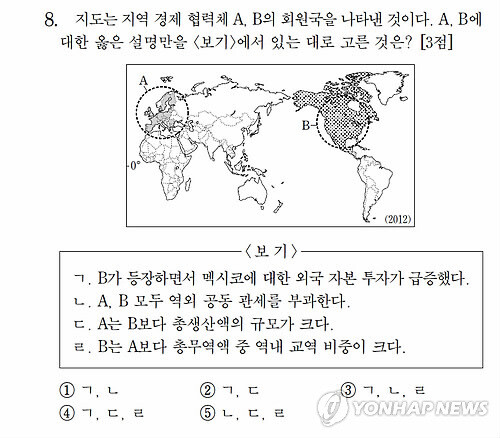 출제 오류로 판정된 2014학년도 대학수학능력시험 세계지리 8번 문항이 모두 정답 처리되면서 당시 오답 처리됐던 수험생 1만8천여명 중 절반에 가까운 9천73명의 등급이 한 등급 오르게 됐다.