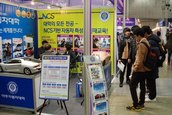 ‘스펙보다는 능력’이라는 주제로 열린 이번 박람회에서 아주자동차대학은 다양한 자동차 분야의 직무를 교육하기 위해 개발한 NCS교육과정과 자동차분야로 전문화된 7개 전공을 소개했다.
