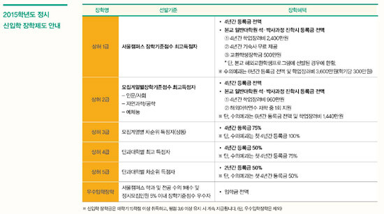 건국대는 2015학년도 정시모집에서 인문사회/예체능계열 수능 4개 영역 백분위 합 392점 이상(평균 98점) 학생에게는 4년간 등록금 전액과 4년간 학업장려비 2400만 원 지원뿐만 아니라 건국대 대학원 석박사과정 등록금 전액까지 지원하는 ‘KU 글로벌리더 장학 1급’을 신설했다.